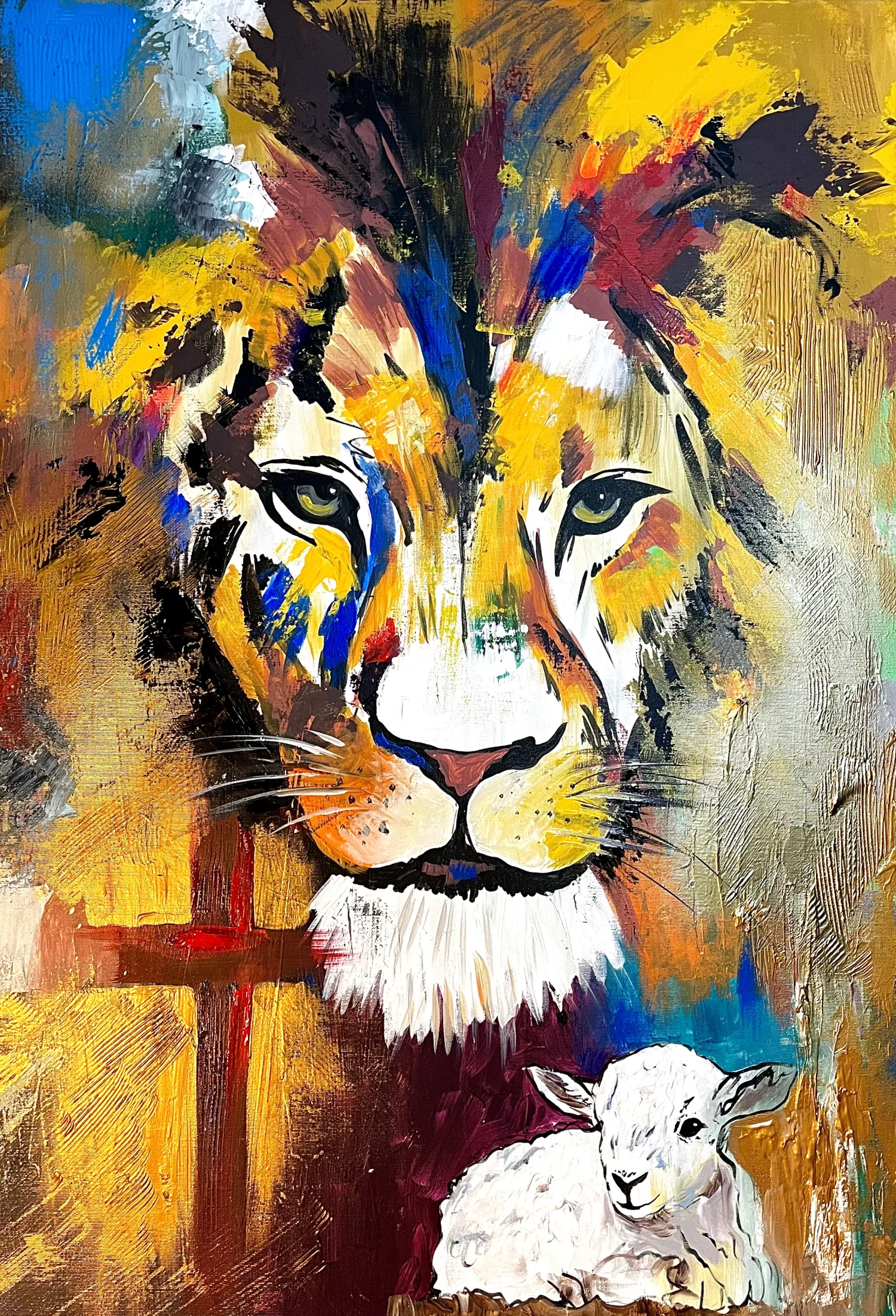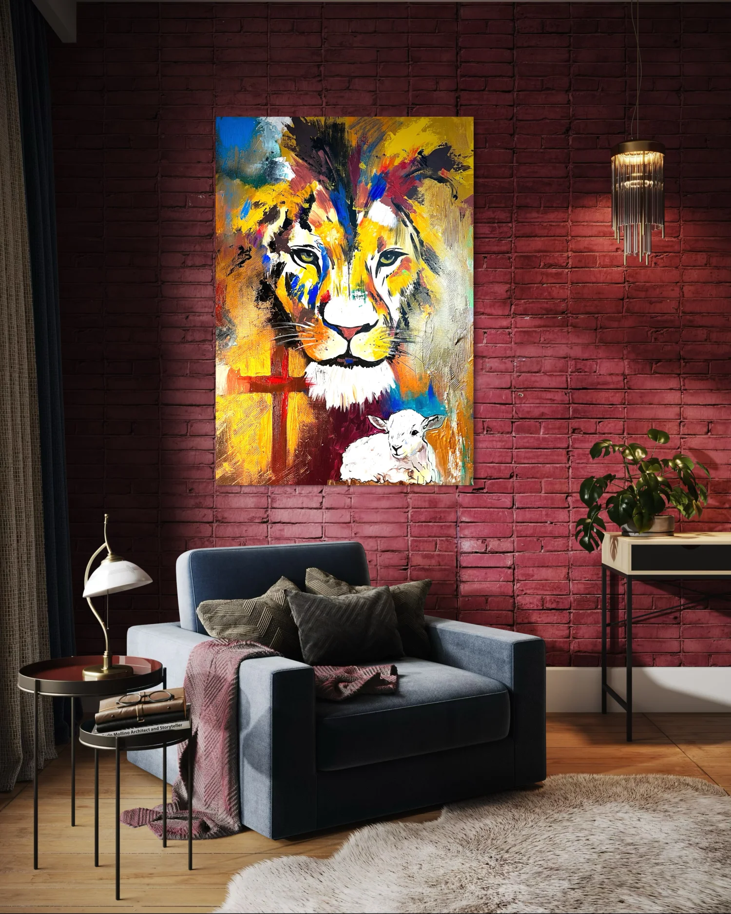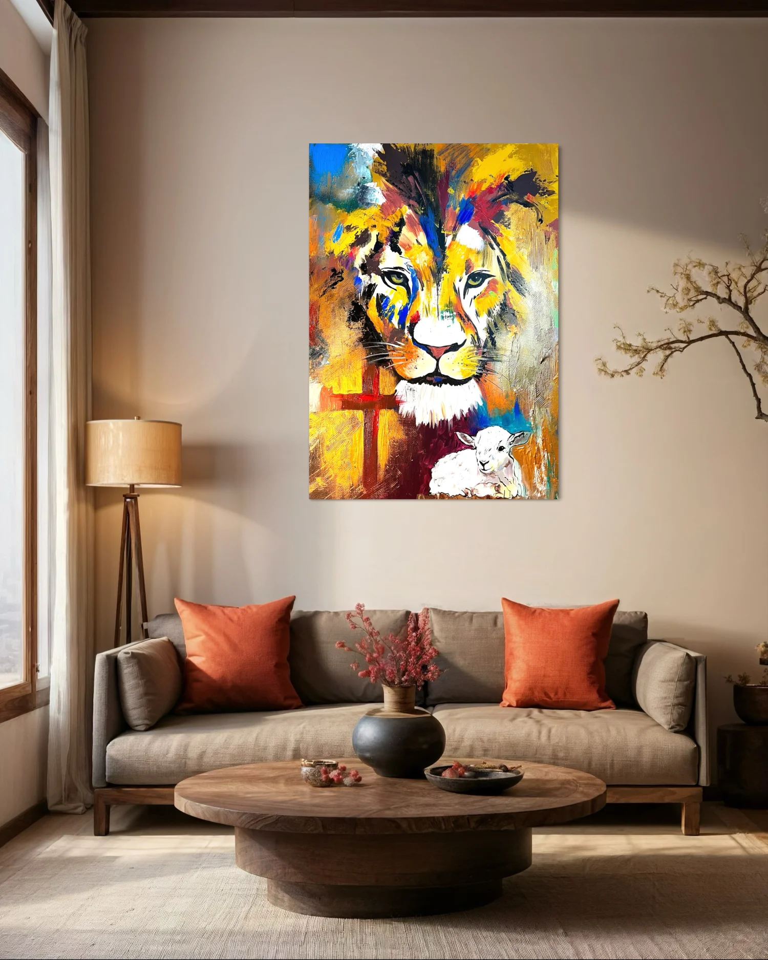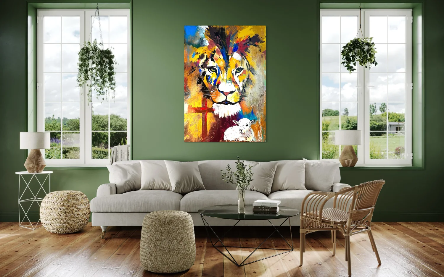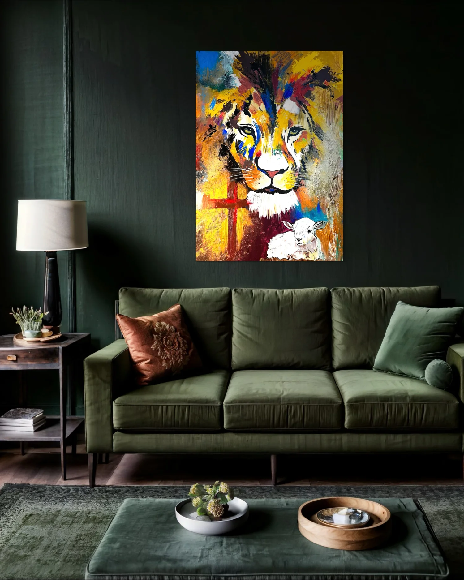Grafika lwa i baranka wydrukowana na płótnie.